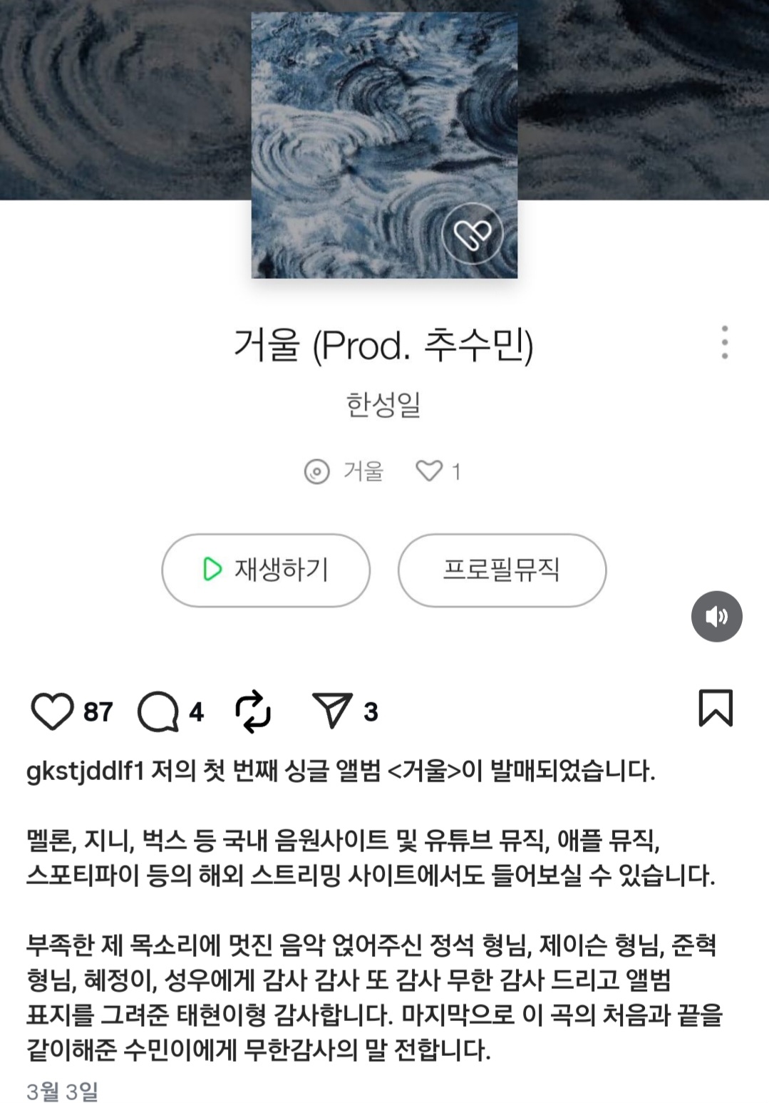 한성일 가수의 인스타에도 있으니 들어보셔요~